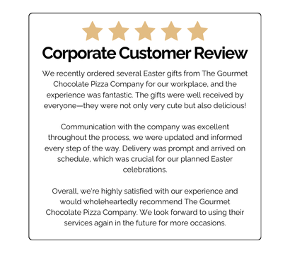 We have worked with many businesses over the last 18 years to create their very own unique set of corporate gifts complete with branding and personalisation, and have a plethora of happy clients to prove it. To join our list of happy clients, give us a call on 0115 989 4254 or email us at orders@gourmetchocolatepizza.co.uk and see how we can help you!