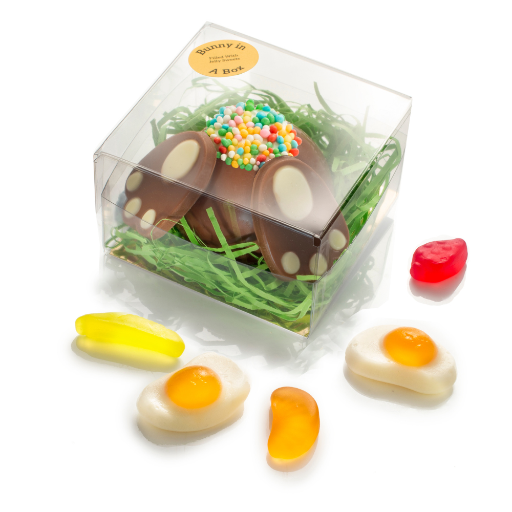 Back by (very!) popular demand, is our Bunny in a Box. Each bunny is handmade using Belgian milk chocolate, and filled with a selection of Spring-themed jelly sweets hiding inside. For an adorable finishing touch, each bunny even has a white chocolate bobtail covered in 100s and 1000s, and white chocolate paw pads! This is a perfect gift for those customers that want something small and sweet, and made with an artisan touch.