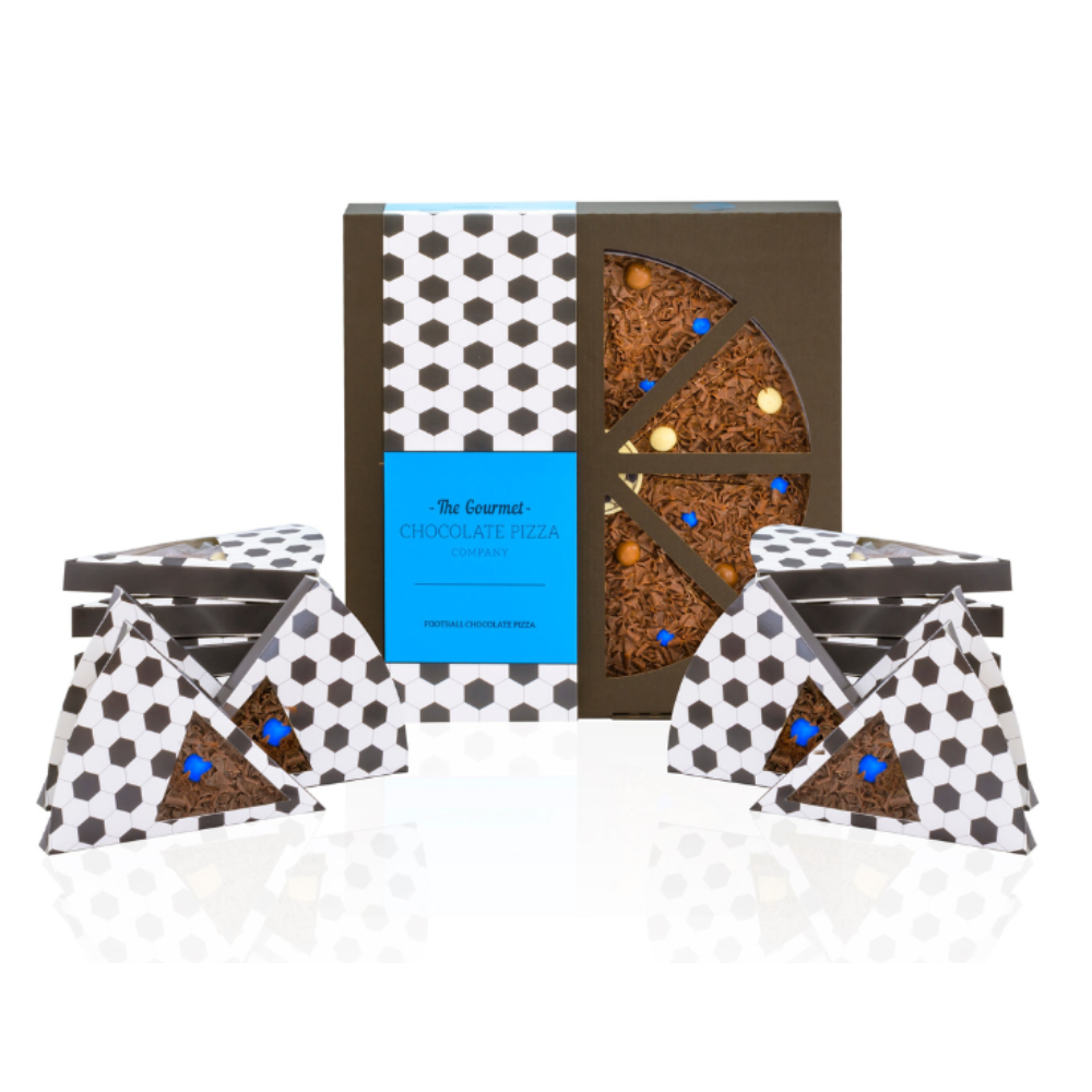 Our football themed pizzas offer the perfect way for your customers to celebrate their team's victory or enjoy the match together. These pizzas are generously sized and pre-cut into slices, making it effortless to share. Simply open the box and pass it around! They are handcrafted with a Belgian milk chocolate base, decorated with milk and white chocolate rice balls, red or blue chocolate drops, and milk chocolate curls.